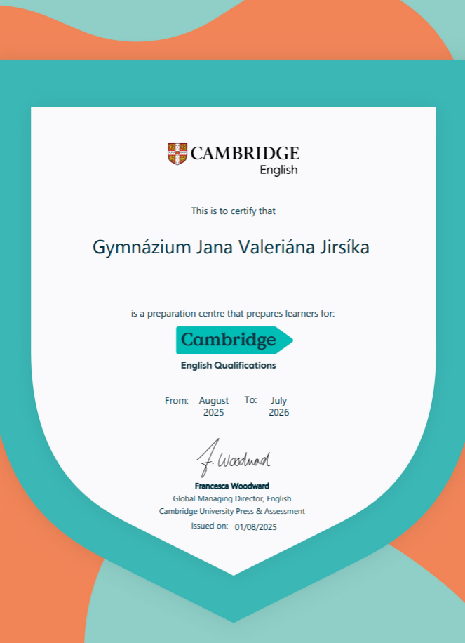 Mezinárodně platný certifikát potvrzující jazykovou úroveň je důležitou součástí kvalifikačního portfolia každého studenta a od letošního školního roku navíc mají studenti možnost nahradit tímto certifikátem odpovídající úrovně profilovou maturitní zkoušku z cizího jazyka.